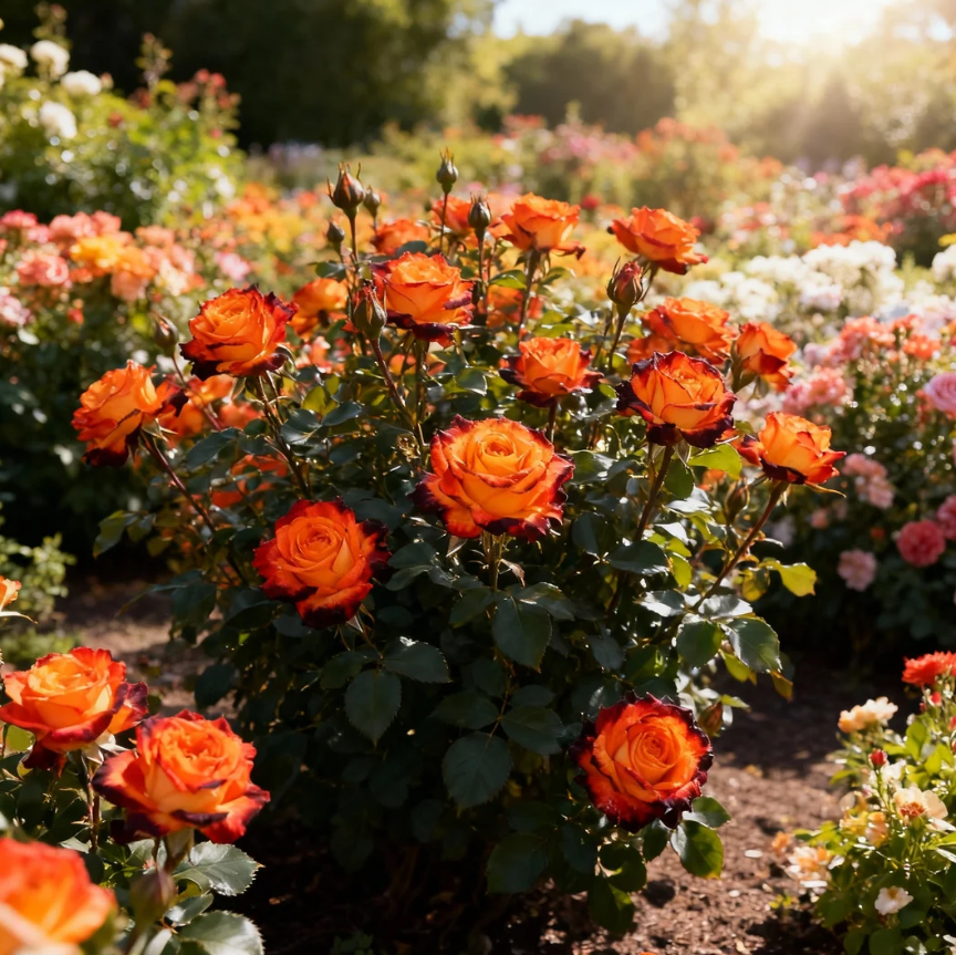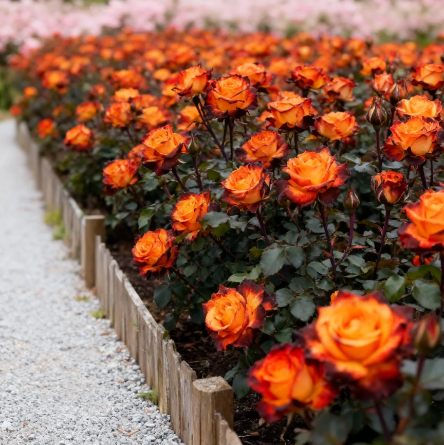 Огнената роза „Firestorm“ пленява с наситени оранжево-червени цветове и фино златисто сияние по краищата на венчелистчетата – като живи пламъци, които танцуват на слънце.