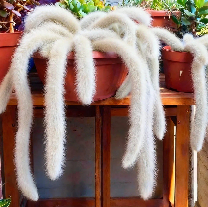 Уникална форма: Кактусът „Маймунска опашка“ има дълги, меки стъбла, които се спускат като опашка на маймуна, придавайки висока декоративна и артистична стойност. 🐒